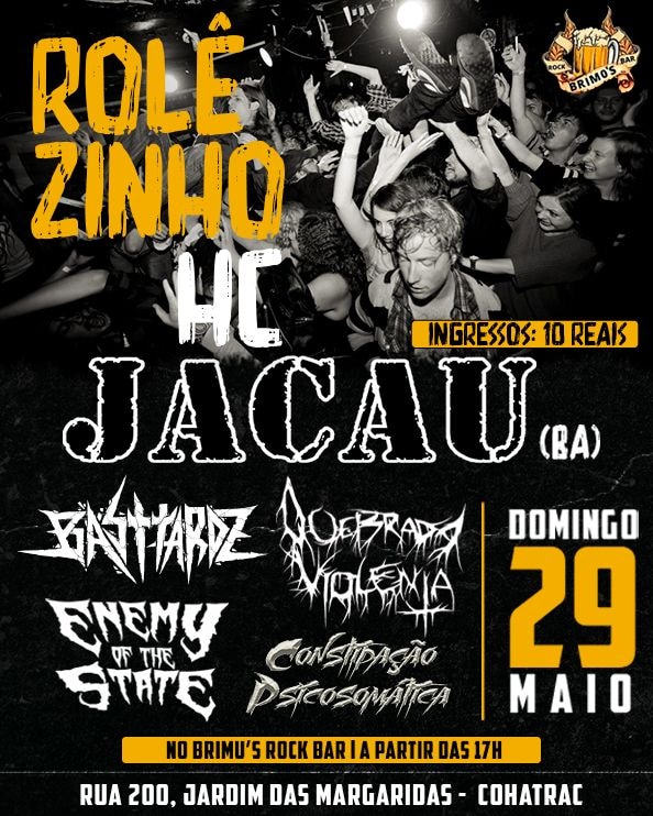 Neste domingo (29), a partir das 17h, BASTTARDZ, CONSTIPAÇÃO PSICOSSOMÁTICA, ENEMY OF THE STATE, QUEBRADA VIOLENTA e a JACAU (BA), estarão se apresentando na Brimo's Rock Bar. Ingressos somente no local - R$ 10.