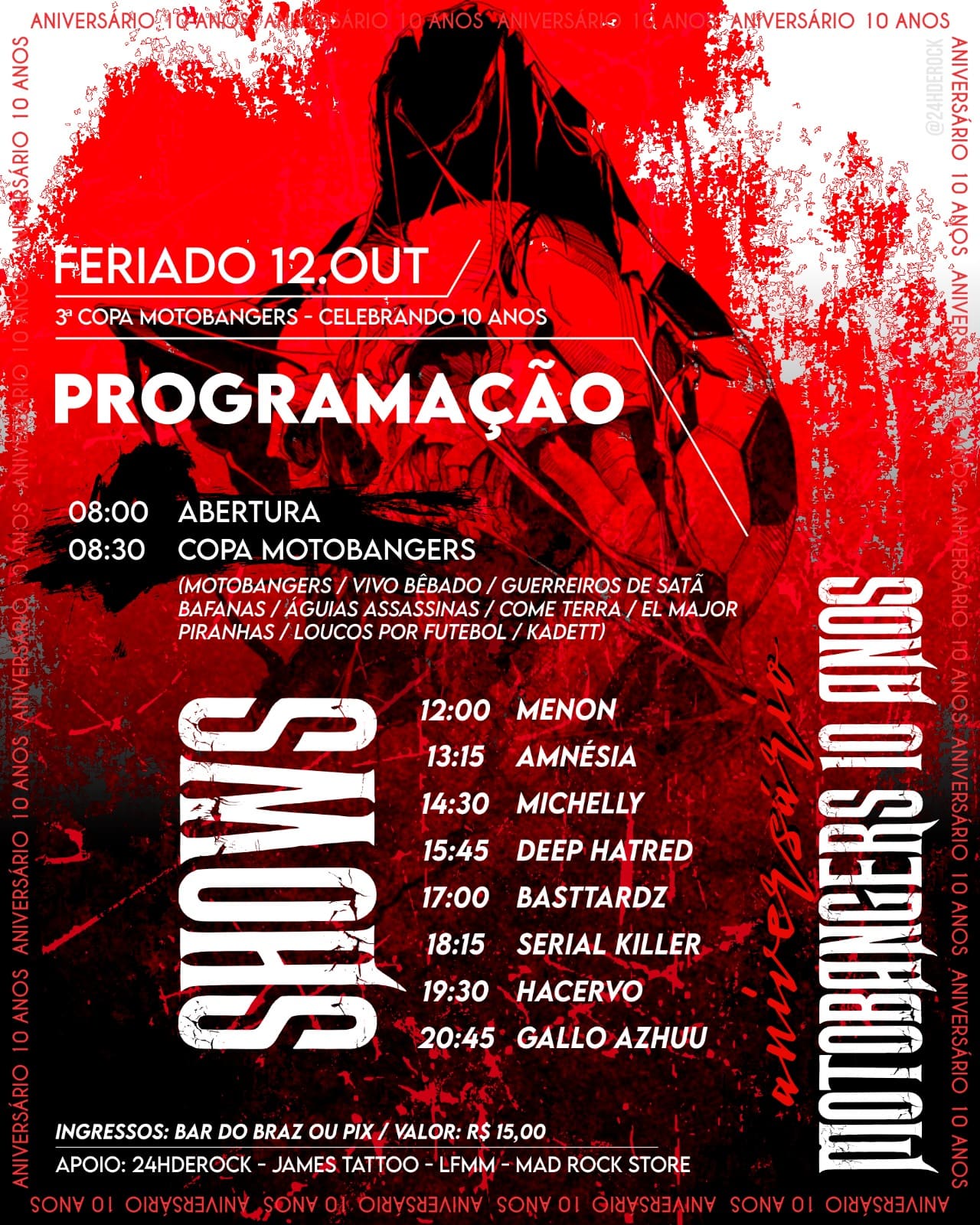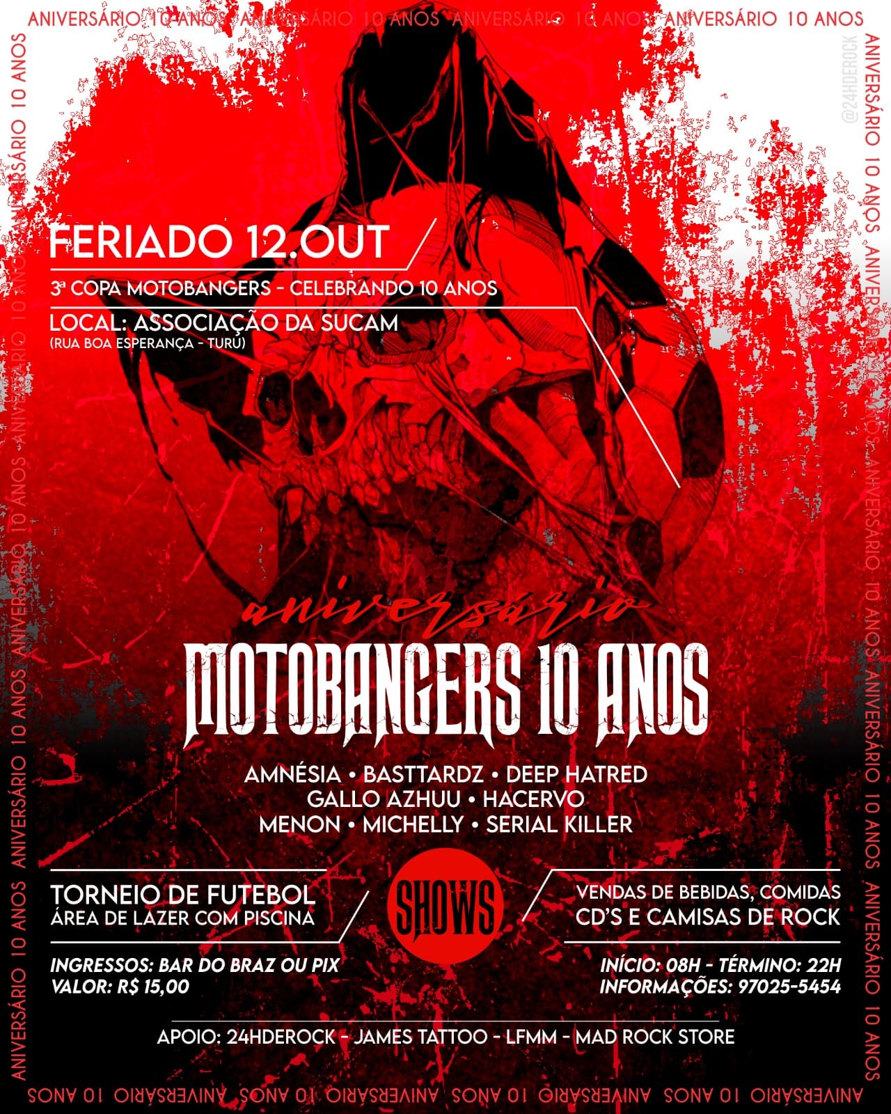 A Motobangers completa dez anos e irá celebrar o aniversário com shows e torneio de futebol. Será dia 12 de outubro, a partir das 8h, na Associação da Sucam. Também terá vendas de bebidas, comidas, cd's e camisas de rock.